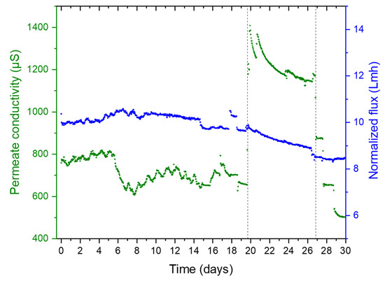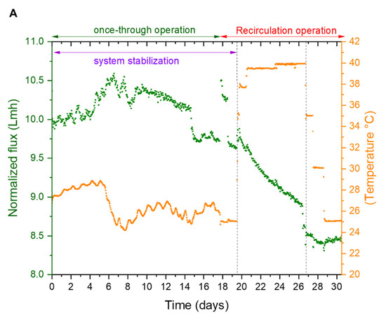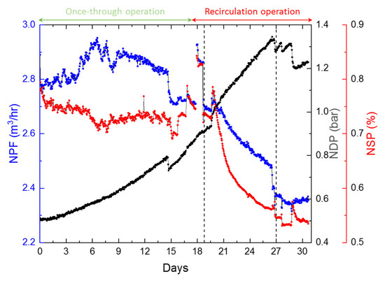 From Figure 6, it can be seen that there was a 0.43 bar increase in normalized differential pressure (NDP), corresponding to a 2.5% decrease in normalized permeate flow (NPF) during the once-through operation mode. There was a subsequent increase of 0.3 bar in NDP and a corresponding 13.9% decrease in NPF during the recirculation operation mode, which raised the temperatures to 40 °C. Hence, the increase in NDP was certainly not the reason behind the steep decrease in NPF, which increased the pressure required to maintain the recovery rate. There was also a reduction of 0.2% in normalized salt passage (NSP) post recirculation operation, which points toward a possible membrane surface compaction. The changes in NPF and NSP are with reference to the initial conditions at the startup of the experiments; hence, they represent the actual change in the parameter rather than measurement errors.