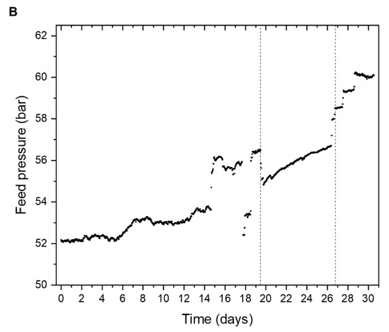 It can be seen from Figure 5A that a lower pressure was required to maintain a constant recovery at an elevated temperature. Permeate flux increased as the feed temperature increased. The viscosity of seawater decreased as temperature increased, and the water permeation rate through the membrane increased. Permeate flux typically increased with temperature linearly with viscosity [39,40,41]. When the RO feed temperature increased from 25 °C to 40 °C, the feed pressure reduced from 56.5 bar to 54.8 bar. On the contrary, when the RO feed temperature decreased from 40 °C to 25 °C, the feed pressure increased from 56.7 bar to 60.25 bar. The additional pressure buildup during the reduction in operating temperature resulted from operation at higher water temperature, possibly causing compaction of the membrane surface. Higher temperatures also increased the solubility of the solute, and a higher diffusion rate of the solute through the membrane was possible [41], causing a reduction in salt rejection by the membrane, as observed in Figure 5B. Figure 5B shows that when the RO feed temperature increased from 25 °C to 40 °C, salt rejection decreased. However, when the feed water temperature returned to 25 °C, we saw an increase in salt rejection by 0.2%. This improvement in salt rejection possibly results from membrane surface compaction, but it comes at the cost of additional energy expenditure, as discussed earlier. Salt rejection is calculated as follows: