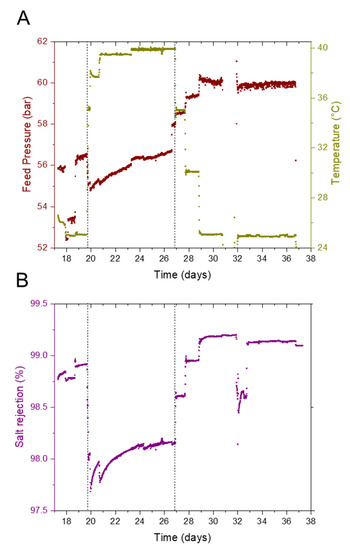 Operating data of the pilot test, data captured from the distributed control system (DCS). The plots (A) show the variation in normalized flux and (B) feed pressures with changes in feed temperature. The dotted vertical lines indicate the period where the feed water temperature was maintained at 40 °C.