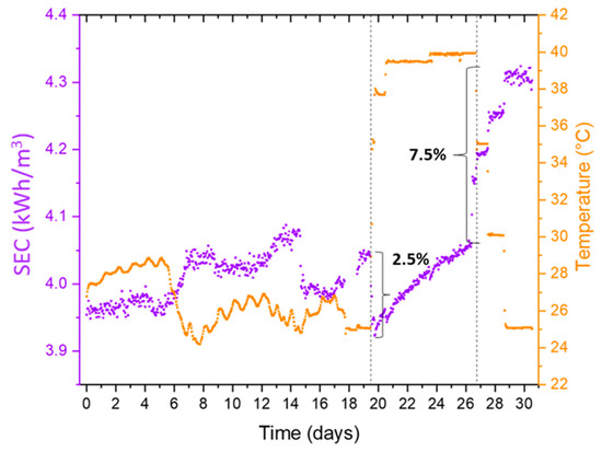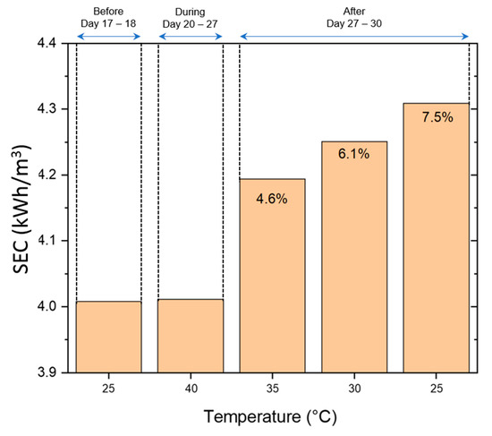 Average specific energy consumption (SEC) before, during, and after short-term (7-day) RO-feed seawater temperature increase. The change in SEC can also be correlated with the change in NPF, as discussed in Figure 6.