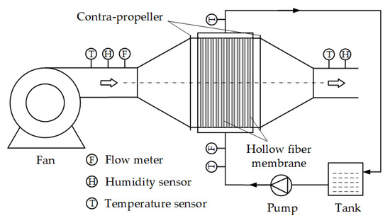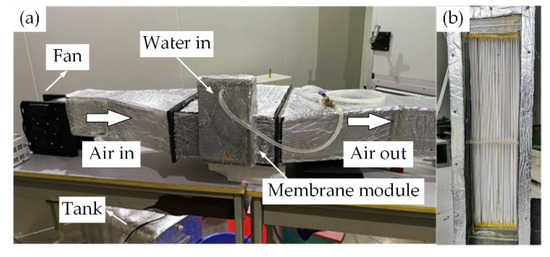 An evaporative cooler employs the principle of heat absorption by water evaporation to cool the air stream, which is an energy-saving, environmentally friendly, and efficient air cooling method [11,12,13]. Evaporative coolers can be divided into indirect evaporative coolers [14,15] and direct evaporative coolers [16,17,18] according to the different methods of contact between the water and air stream. The outlet air humidity remains constant for an indirect evaporative cooler [15], while it increases for a direct evaporative cooler [19], which has a better cooling performance [20]. In hot–dry regions, such as Northwest China, cooling and humidifying fresh air sent into a room is necessary. Therefore, a direct evaporative cooler has better applicability [21]. However, a direct evaporative cooler demands a higher water quality, and the cooling air is entrained with water droplets [22]. The proposed evaporative cooling technology based on hollow fiber membranes overcomes these drawbacks, as the membranes with high selective permeability prevent the transmission of liquid water and microorganisms and allows for water vapor transmission [23].