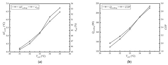Figure 3. The effect of the inlet air temperature on the performance of the HFMEC: (a) air temperature drop and wet-bulb efficiency; (b) cooling capacity and COP.
