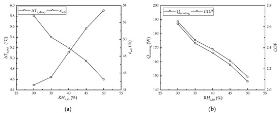 Figure 4. The effect of the inlet air relative humidity on the performance of the HFMEC: (a) air temperature drop and wet-bulb efficiency; (b) cooling capacity and COP.