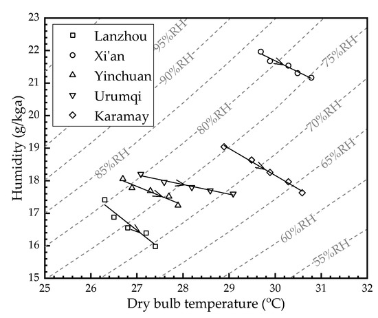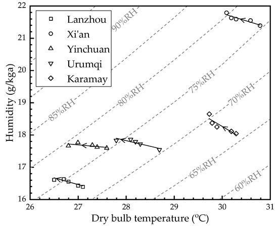 According to Figure 7, it can be seen that the air temperature drop in the HFMEC under the climatic conditions of the five cities studied is from largest to smallest: Karamay, Urumqi, Lanzhou, Xi’an, and Yinchuan. This means that the HFMEC had higher air temperature drops in areas with high dry bulb temperatures and low humidity.