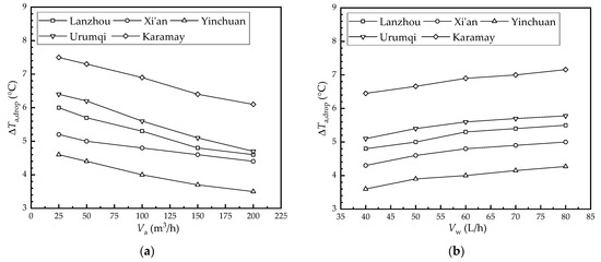 As seen in Figure 7b, the air temperature drop in Lanzhou, Xi’an, Yinchuan, Urumqi, and Karamay increased from 4.8 °C, 4.3 °C, 3.6 °C, 5.1 °C, and 6.5 °C to 5.5 °C, 5.0 °C, 4.3 °C, 5.8 °C, and 7.2 °C as the water flow rate increased from 40 L/h to 80 L/h, respectively. Further, their values increased by 14.6%, 16.3%, 18.6%, 13.3%, and 11.0%, respectively. This was because the convective heat transfer coefficient on the water side increased with the flow rate; therefore, the heat removed by the water stream increased. Thus, the air temperature drop increased.