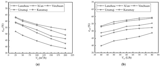 Figure 8 shows the effect of the flow rate on the wet-bulb efficiency in each city. As seen from Figure 8a, the wet-bulb efficiency of Lanzhou, Xi’an, Yinchuan, Urumqi, and Karamay decreased from 59.3%, 63.3%, 52%, 58.8%, and 62.9% to 46.4%, 53.5%, 38.9%, 42.6%, and 49.3% as the air flow rate increased from 25 m3/h to 200 m3/h, respectively. Further, their values decreased by 12.9%, 9.7%, 13.2%, 16.2%, and 13.6%, respectively. According to Equation (1), it can be found that the air temperature drop decreased as the air flow rate increased. Therefore, the wet-bulb efficiency had a similar trend as the air temperature drop. Meanwhile, it can be seen from Figure 8b that the wet-bulb efficiency of Lanzhou, Xi’an, Yinchuan, Urumqi, and Karamay increased from 48.9%, 53.5%, 39.9%, 46.4%, and 53.1% to 55.4%, 59.4%, 48.8%, 52.5%, and 58.9% as the water flow rate increased from 40 L/h to 80 L/h, respectively. Further, their values increased by 6.6%, 5.8%, 8.9%, 6.0%, and 5.8%, respectively.
