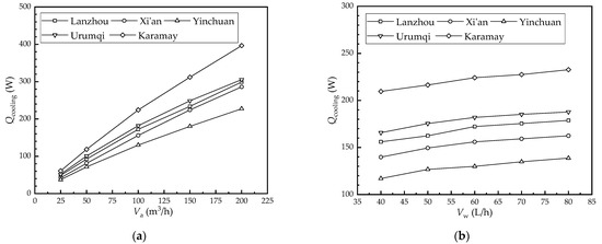 As seen in Figure 9b, the cooling capacity of Lanzhou, Xi’an, Yinchuan, Urumqi, and Karamay increased from 155.9 W, 139.7 W, 116.9 W, 165.7 W, and 209.6 W to 178.7 W, 162.4 W, 138.7 W, 187.8 W, and 232.6 W as the water flow rate increased from 40 L/h to 80 L/h, respectively. Further, their values increased by 22.7 W, 22.7 W, 21.8 W, 22.1 W, and 23.1 W, respectively. This was because the convective heat transfer coefficient on the water side increased as the water flow rate increased; therefore, the cooling capacity of the HFMEC increased.