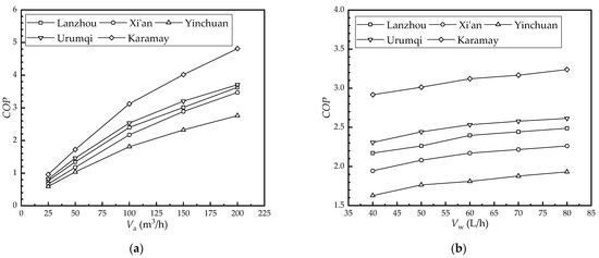 As seen in Figure 10b, the COP of Lanzhou, Xi’an, Yinchuan, Urumqi, and Karamay increased from 2.17, 1.95, 1.63, 2.31, and 2.92 to 2.49, 2.26, 1.93, 2.61, and 3.24 as the water flow rate increased from 40 L/h to 80 L/h, respectively. Further, their values increased by 0.32, 0.32, 0.30, 0.31, and 0.32, respectively. The water flow rate was controlled by the valve opening. Therefore, the effect of the water flow rate’s variation on the system’s power was negligible.