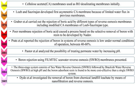 The average boron contents in the respective water resources are different due to the geochemical nature of the drainage area, the proximity to marine coastal regions and the imputes from industrial and municipal effluents [12]. In the readily available seawater treating applications, boron removal is conducted as the post-treatment procedure after desalination via Sea Water Reverse Osmosis (SWRO) membranes because they are efficient at removing charged species such as the borate ion rather than neutral molecules such as boric acid [13]. Desalination is a way of recycling seawater in order to obtain a steady supply of high-quality freshwater through the treatment of seawater and brackish groundwater. Figure 1 shows the evolution of desalinating technology as well as how changes have been made in terms of membrane technology and the desalinating process related to the removal of boron components.