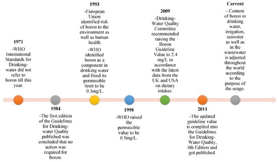 The safe uptake of boron content in a human body is 20 mg, and food contributes greatly to the increment of boron content [23]. The risk to human health is through ingestion, which is through drinking, cooking and teeth-brushing. A boron level in water of more than 0.5 mg/L is perceived to be safe for bathing, hand-washing and dishwashing [24]. As shown in Figure 2, the boron limit in drinking water has undergone progress to result in a boron limit of 2.4 mg/L by the World Health Organization (WHO) [25]. As shown in Table 1, the tolerance limit of crops in absorbing the boron through soils or any water resources should be considered in order to use the treated water for irrigation purposes. This can be attributed to the reduction in the growth and quality of crops. Although the new guideline value is based on a human health perspective, some utilities may set the product water limits of seawater desalination plants to be as low as 1 mg/L to reflect agricultural-related issues [26].