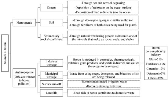 Boron enters the environment through natural and human-made processes. The natural weathering of soils and rocks releases boron into the water [33]. Currently, the demand for boron has increased due to the active development of modern architecture, which results in the evolution of the electronics, telecommunications (LCD screens), automotive, aviation and energy industries [34]. Boron is widely used in manufacturing fiberglass, detergents and bleaches [30]. Its highly volatile and soluble nature causes the boron waste from industries to be released into the atmosphere, forming boric acid to be combined in the water resources [35]. Figure 5 shows the origins of boron and the occurrence of pollution due to the presence of boron. Although nature has its own way of releasing boron, it is undeniable that human activities contribute to 90% of boron production [32,36].