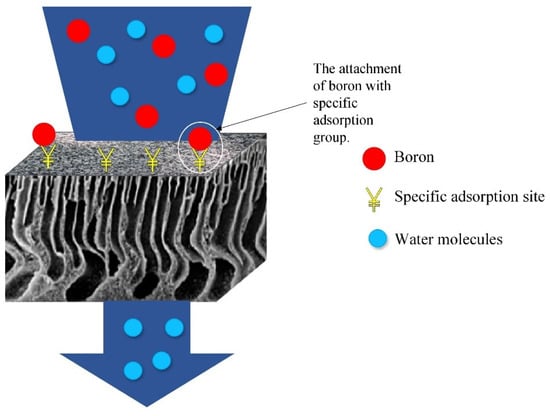 The permeability is correlated with the hydrophilic nature of the membrane, which affects the movement of water molecules in the membrane matrix. Hydrophilicity is the ability of a specific material to draw water molecules, which can expand water channels in the membrane matrix. Most adsorbents that are used for boron removal, such as resins [85], metal oxides [85], nanotubes [86] and the metal organic framework [87], are hydrophilic. Hydrophilic materials in a membrane matrix provide the ability for water molecules to be spread across, thus maximizing the contact. This can be related to membrane fouling, as the plugging of pore openings in the structure of a membrane can cause surface contamination, which leads to the deterioration of the membrane performance. With hydrophilic adsorbents filling up the pores of the membrane, the water permeation is enhanced due to the function of adsorbents as the water carrier throughout the membrane process. The increase in permeability also happens due to an increase in the polymer network free volume and the formation of cavities in the nanoparticle–polymer interface [88,89]. This is why adsorptive membranes are perceived to be suitable for boron removal, as they can provide better rejection without hampering the water flow. To make this achievable, it is important to come up with the optimum adsorbent amount that can be tolerated by a boron-adsorptive membrane. The rapid adhesion and deposition of adsorbents on the membrane due to the exceeding optimum value can cause pore blockage and reduction in the boron rejection.