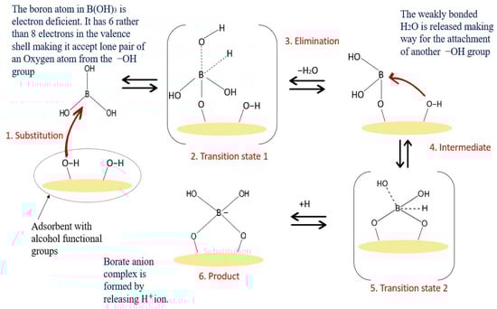 Adsorptive membranes are suitable to be used for boron removal as they retain boron molecules faster and provide a lower energy consumption and higher permeate flux. These membranes are easily functionalized to attach multiple functional groups as adsorption sites for favorable binding in order to maximize the adsorptive efficiency, as shown in Figure 6. The attachment of boron with a specific adsorbent can be described by a possible binding mechanism proposed in Figure 7. As shown in Figure 7, the -OH groups show a high affinity to boron, while these groups are not reactive to other elements. Adsorbents with these alcohol groups tend to bond through the formation of boric acid esters of boron or borate anion complexes with a proton as a counterion. Therefore, boron forms a coordination complex through a covalent attachment. As for the boron that exists as borate anions in water, it will be bonded with a positively charged adsorbent through ion exchange, and the structures are shown in Figure 8. Due to the release of acidic protons during complexation, the pH of the solution decreases. This complexation reaction also plays a vital role in boron uptake from water. The stability of the borate complex depends on the type of diol in the adsorbent. If the diol involves -OH groups being oriented in such a way that they accurately match the structural parameters required by tetrahedrally coordinated boron, a strong complex will be formed [82]. A stronger and stable complex will be able to provide efficient boron uptake.