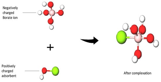 The effect of pH plays a major role in determining the adsorption performance of the adsorbent. The mechanism of boron adsorption is mainly reflected by the surface charge of the adsorbent at various pH values of the adsorbate solution. As reported by the boron adsorption removal study by commercial and modified activated carbons, the maximum boron adsorption was found at a pH value of 8.5, and the boron removal did slightly decrease when the pH value was lowered from 7 to 3 [95]. Another study using RO membranes showed more than 99% of boron removal at a higher pH value [96]. This is due to the electrostatic repulsion between the negatively charged RO membrane and the borate ions. The boric acid solution dissociates into a negatively charged borate ion at higher pH values, causing more boron to get rejected.