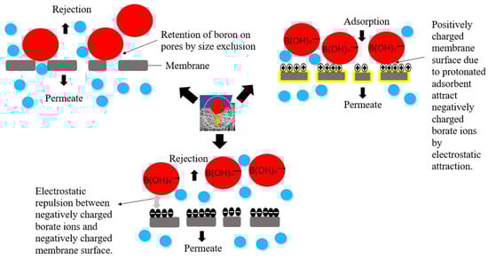 The adsorptive selectivity is crucial in quantifying the efficacy of an adsorption process regardless of the forms in which an adsorbent is utilized. It is based on the number of preferential locations on the pore space of an adsorbent for binding guest species such as boron. Boron adsorption happens in two steps: (i) affinity between the chelating group on the surface of an adsorbent with H3BO3 molecules, and (ii) physical attraction initiated by various forces such as Van der Waals, electrostatic attraction (between a protonated adsorbent and BOH4− ions) or hydrogen bonding (bonding of -OH groups from H3BO3 molecules or BOH4− ions with -OH groups), as shown in Figure 9. From Figure 9, the selectivity of boron through an adsorptive membrane also relies on the surface charge of the membrane. High positivity or negativity due to the surface charge of resultant adsorptive membranes facilitates electrostatic attraction and leads to higher adsorption of boron on the adsorption sites [72]. Logically, a more positively charged membrane surface can increase the number of negatively charged borate ions on the surface for further adsorption. However, the insertion of the UiO-66 nanoparticle via the implementation of a thin-film composite membrane shifted the zeta potential to be negative due to the hydrolysis of the acyl groups in providing -COOH. However, the boron rejection rate was very much enhanced [84]. This could be due to the ability of the negatively charged membrane surface to draw more water molecules to the membrane surface, which was followed by the presence of many boron compounds.