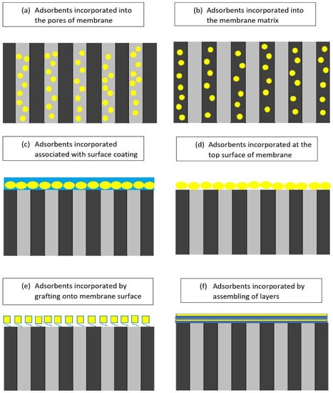 An adsorptive membrane is considered as a hybrid technology due to its dual functionality of adsorbing and filtering out pollutants. This membrane relies on a mass transfer process whereby the pollutants will get attached on the solid surface via chemical or physical interactions. Apart from offering flexibility in the design, this membrane is perceived to be cost-efficient due to its ability to regenerate adsorbents. The term “adsorption” was first coined in 1881 by a German physicist called Henrich Kayser [69]. It was further expanded in the mid-1980s [70]. Adsorption happens when separated or targeted ions are adsorbed on the membranes, when the solvent permeates through the pores of membranes that provide high flow rates and low internal diffusion along with faster adsorption and desorption rates [71]. Adsorptive membranes are highly utilized for the purpose of heavy metal removal [72], biotechnology-related separations [73] and other water and wastewater treatment applications [74]. This method is said to be simple and effective, as the adsorbent incorporated into the membrane matrix has the capability of capturing pollutants via chemical or physical relation.