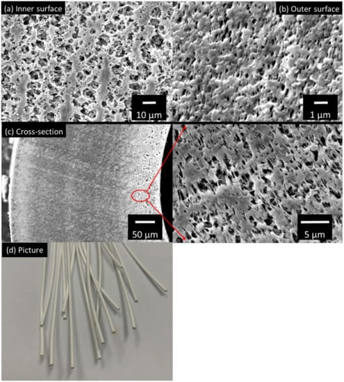 Figure 2a,b show the surface images of the STOMATE® hollow fiber membrane. Both the inner and outer surfaces have macroporous structures with visible pores observed. These macroporous morphologies are desirable for MD applications as they promote vapor transportation. The mean pore size data is provided by the company, which is 0.08 ± 0.02 µm. This value is at the lower end of the typical pore size ranges (0.1–0.6 µm) recommended for MD processes [36,38]. The smaller pore size would help to prevent membrane wetting under different operation conditions, especially when there is a high salt concentration such as in RO brine [39]. Figure 2c displays the cross-section morphology and Figure 2d shows a photographic image of the fiber. The membrane has a porous cross-section and is macrovoid-free. This macrovoid-free structure could help to increase membrane wetting resistance and membrane mechanical properties as compared to macrovoid structures. Moreover, this structure may provide better performance stability during long-term operations. Despite the macrovoid-free structure, the hollow fiber still possesses a good porosity of 65.5%; this is suitable for MD applications [36].