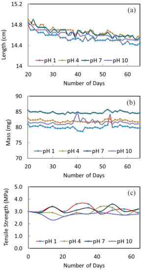 Figure 3. The variation of fiber (a) length, (b) mass and (c) tensile strength after been immersed in the different pH solutions.