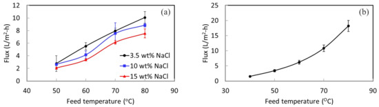 Figure 4. (a) DCMD flux under different feed temperatures and concentrations, and (b) VMD flux at different temperatures with a 3.5 wt% NaCl feed.