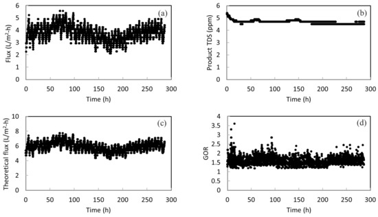Figure 5. (a) The permeate flux for the pilot-scale testing; (b) the total dissolved solids (TDS) amount in the product water; (c) the theoretical flux calculated for the pilot-scale testing; and (d) the GOR of the system with heat recovery from the condenser.