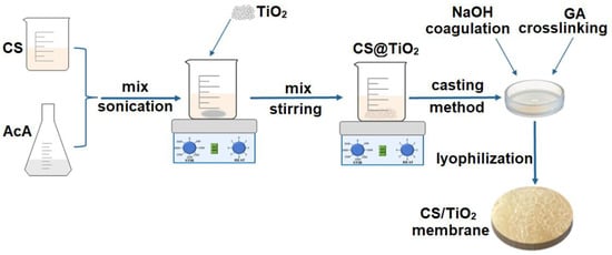 Figure 1 illustrates a schematic chart of the preparation of chitosan/TiO2 composite membranes through a simple casting method. First, chitosan (2 g) was dissolved in a 1% acetic acid solution. Then, TiO2 was added to the as-obtained chitosan solution previously synthesized through the sol-gel method; afterwards, the mixture was magnetically stirred at room temperature for 24 h and then sonicated for 4 h at 35 °C to obtain a homogenous solution. For this experiment, two polymer solutions with 1% and 5% (w/w) TiO2 nanoparticles were obtained. The solutions were cast into Petri dishes and dried in an electric oven at 50 °C overnight. The obtained membranes were treated with NaOH solution for 24 h to coagulate the chitosan; afterwards, they were washed with distilled water to remove side products and excess NaOH. To cross-link the obtained membranes, they were placed in a diluted glutaraldehyde solution (200 mL, 2% v/v) for 24 h under magnetic stirring. This was followed by washing with distilled water to remove any remains from the glutaraldehyde. The synthesized composite membranes were further lyophilized and analyzed through proper techniques.
