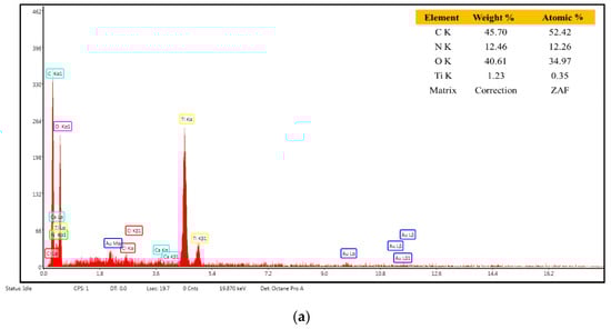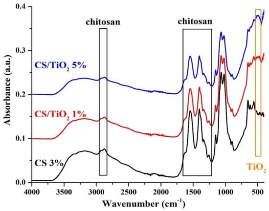 Additionally, the presence of TiO2 produces a double peak at ~500 cm−1 due to the Ti-O stretching vibration (observable only in chitosan/TiO2 samples). Comparison between the chitosan and chitosan/TiO2 composite membranes indicates their interactions; this interaction is represented by the formation of Ti-O-Ti stretching bonds at wavelengths ranging from 476 cm−1 to 508 cm−1 [70,71].