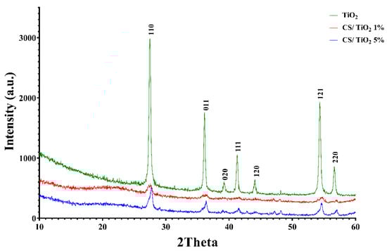 An XRD analysis was carried out (Figure 4) to reveal the crystalline structure of the synthesized chitosan and chitosan/TiO2 composite membranes.