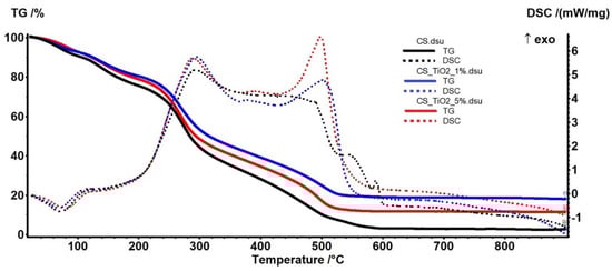The thermal analysis results are presented in Figure 5 for chitosan and chitosan/TiO2 composite membranes. The comparison between the samples can be made based on the data from Table 2. The samples are losing residual water molecules up to 105 °C (~7–10%), and a weak endothermic effect accompanies the process on the DSC curve [73].