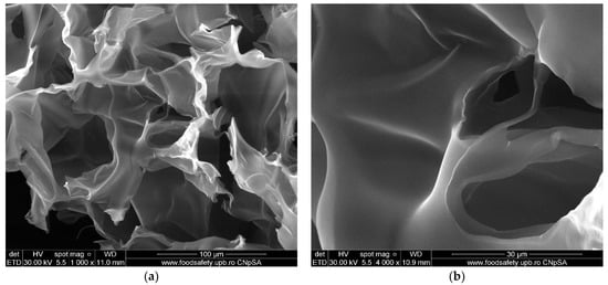Figure 8. SEM images of simple chitosan CS membrane: (a) 1000× magnification, (b) 4000× magnification.