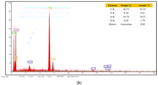 Figure 11. EDX spectra and elemental composition: (a) chitosan/TiO2 1%, (b) chitosan/TiO2 5%.