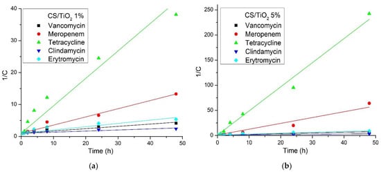 Figure 15. The plots of 1/C vs. irradiation time (t) for (a) CS/TiO2 1% and (b) CS/TiO2 5% membranes.