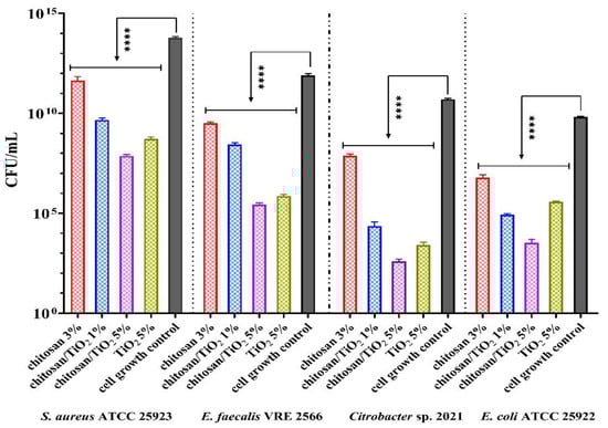 Figure 17. The influence of chitosan-based membranes against Gram-positive and Gram-negative bacteria. The significant differences between groups and cell wall control were statistically analyzed using one-way ANOVA, followed by Dunnett’s multiple comparisons test (**** p < 0.0001).