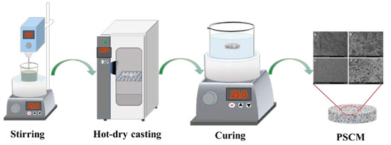 The commercial silicate cement powder (P.O 52.5) was ground with a ball mill for 12 h to make the cement powder more uniform and compact. Then, the ball-milled silicate cement powder and deionized water were mixed evenly in a certain proportion of 40 wt. %, 50 wt. %, 60 wt. %, stirred, and degassed in a vacuum. The mixed silicate cement paste was poured into a self-made Teflon mold and then sealed into the vacuum drying oven with a temperature of 40 °C, 60 °C, 80 °C, and 100 °C for 10 h each. After the curing process (humidity: 100%, temperature: 25 °C), which lasted 20 days to ensure the complete hydration reaction, the PSCM was acquired. A schematic diagram of the hot–dry casting technique for fabricating the PSCM is shown in Figure 1.