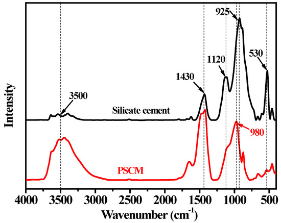 The silicate cement mainly consisted of massive Alite (925 cm−1, 530 cm−1) and a certain proportion of carbonate (1430 cm−1) and gypsum (1120 cm−1). The difference between silicate cement and PSCM was investigated by FT-IR, as shown in Figure 2. The spectral band changed clearly with the hydration process. The characteristic peak of Alite (530 cm−1) corresponded to the surface of the curved vibration of the silicon tetrahedron, and the relative strength of this band rapidly reduced after the hydration process. The peak of the band moved from 925 cm−1 to 980 cm−1, which corresponded to the characteristic band of C-S-H. This change indicated that the hydration process could be used to generate the hydration products, C-S-H. Additionally, 3500 cm−1 represented a hydroxyl vibratory band of the hydration product, which was the characteristic mark of the hydration reaction.
