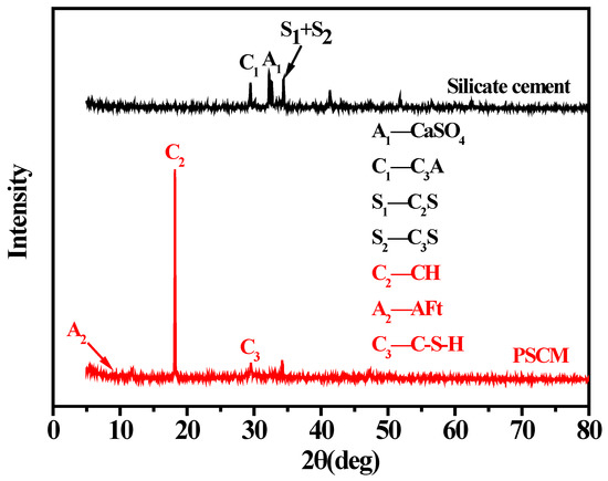 XRD of the silicate cement and PSCM based on the hot–dry casting technique.