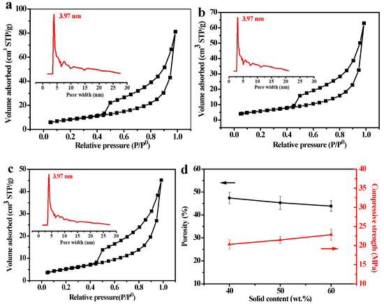 Nitrogen adsorption–desorption curve (in black) and mesoporous pore size distribution (in red) of the PSCM based on the hot–dry casting process with solid contents of (a) 40 wt. %, (b) 50 wt. %, and (c) 60 wt. %. (d) Porosity and compressive strength at different solid contents.