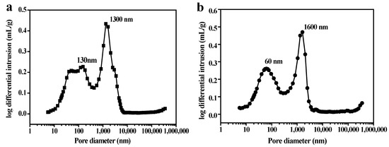 In the casting process of the PSCMs, the secondary modification of the pore walls by hydration products and the formation of capillary pores after the evaporation of water among cement particles can lead to the formation of mesoporous pores. With the temperature increasing from 40 °C to 100 °C, the specific surface area of the PSCMs increased from 21.13 m2·g−1 to 89.65 m2·g−1, while the total pore volume increased from 0.07 cm3·g−1 to 0.13 cm3·g−1. This result showed a strong relationship between the decrease in the density of the PSCMs and the increase in hot–dry temperature.