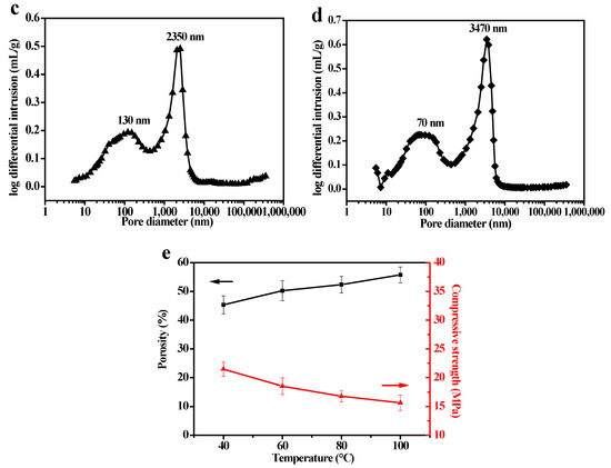 Mercury intrusion porosimetry was employed to further illustrate the pore size distributions of PSCMs at different temperatures (40 °C, 60 °C, 80 °C, 100 °C). As shown in Figure 8a–d, there was typical bimodal pore size distribution in the PSCMs. The highest peak values of the PSCMs prepared at different temperatures were 1300 nm (40 °C), 1600 nm (60 °C), 2350 nm (80 °C), and 3470 nm (100 °C), indicating that the pore size of the PSCMs could be improved with an increase in temperature even if the secondary modification of the pore was made by silicate cement hydration products. The porosity and compressive strength in the PSCMs at different temperatures are illustrated in Figure 8e. Through analysis, it was found that the porosity of the PSCM increased from 45.32% to 55.76% with the increase in temperature, while the compressive strength decreased from 21.46 MPa to 15.66 MPa. Owing to the small traction force at low temperatures, water did not easily evaporate from the cracks of the cement particles, leading to a denser structure or higher compressive strength [36]. However, when the temperature was high, water vapor volatilized into the cement particle gaps and many pores remained under great traction. Moreover, the accumulation of the cement particles was loose, which resulted in the low compressive strength of the PSCM [37].