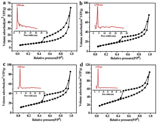 Nitrogen adsorption–desorption curve (in black) and mesoporous pore size distribution (in red) of the PSCMs based on the hot–dry casting process at (a) 40 °C, (b) 60 °C, (c) 80 °C, and (d) 100 °C.