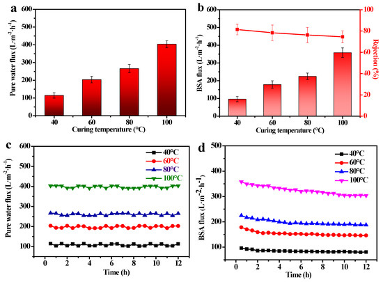 Permeability and separation performance of PSCMs based on the hot-dry casting at different temperatures: (a) the pure water flux of the PSCMs, (b) the BSA flux and rejection rate of BSA solution, (c) the pure water flux stability test of the PSCMs, and (d) the BSA flux stability test of the PSCMs.