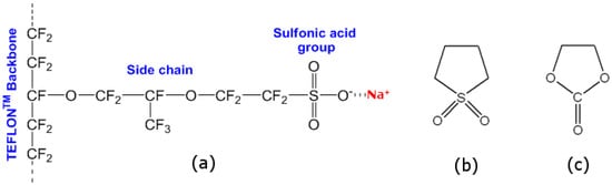 Structural formulas of (a) Na-Nafion, (b) sulfolane, and (c) ethylene carbonate.