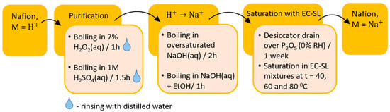 In this work, a commercial Nafion® 115 (equivalent weight is 1100 g mole−1, thickness is 125 µm) (Du Pont de Nemours, Wilmington, DE, USA) extrusion membrane was used. The Na+ form of the membrane was prepared as described in our previous works [,] and shown in Figure 2 over the course of four consecutive stages: purification, neutralization by NaOH, thorough washing, and drying. The samples were first dried in air at 60 °C for 1 h and then in a desiccator at room temperature over P2O5 for seven days. Residual water content and the degree of proton substitution by sodium cations were monitored by infrared Fourier spectroscopy.