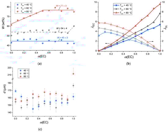 The membranes were saturated with EC–SL binary mixtures of varying composition at 40, 60, and 80 °C. The solvent uptake was defined by the gravimetric technique as described in Section 2.3. Figure 3a illustrates the dependence of the swelling degree W (calculated by Equation (1)) vs. ω(EC). It can be seen that for the lithiated form of Nafion [], an increase in the temperature of swelling leads to an increase in W, although its value itself is much lower (for Li-Nafion W can exceed 200 wt% at Tsw = 80 °C for pure EC), and the type of dependence on the composition of the plasticizing mixture is different for Na-Nafion. At Tsw = 40 °C, the weight uptake does not depend on ω(EC) and equals to 45. At Tsw = 80 °C, the swelling degree increases linearly with an increase in ω(EC) up to 0.5, and subsequently ceases to depend on the composition of the plasticizing mixture. At the swelling temperature of 60 °C, some intermediate state is observed: on the one hand, as for 40 °C, it does not seem to depend on the EC content (with the exception of ω(EC) = 1) and equals 54 wt%; on the other hand, at ω(EC) < 0.5, an increase in swelling degree is observed with an increase in EC content, as for Tsw = 80 °C. Thus, the highest W relates to ω(EC) = 0.5–1 and reaches values of ~77 wt%. For Na-Nafion membranes saturated with binary and ternary mixtures of carbonates, dimethylacetamide, and tetrahydrofuran, W is even lower (20–30 wt% []) and does not exceed 65 wt% for the binary mixture of EC with propylene carbonate [].