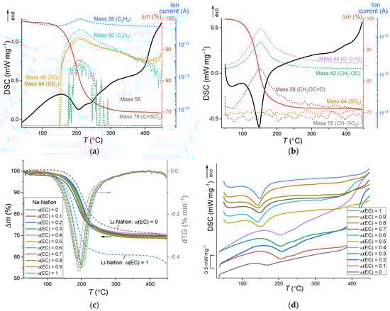 Typical STA curves are shown in Figure 4a,b. For all the samples, one-step weight loss, associated with the process of the solvent removal from the Na-Nafion membrane in the flow of argon, is observed on the TGA curves up to ~300 °C and accompanied by an increase in the ion current of the residues of the initial solvents (ion current of masses 28–78 on Figure 4a–c). The absence of SO2 production in the region < 400 °C for the membranes swollen in pure EC (mass 64 in Figure 4b) confirms the absence of thermal degradation of the polymer matrix, which begins with the degradation of the side chain sulfonic acid groups. The other samples contain SL, the decomposition of which is also accompanied by the formation of SO and SO2 (mass 48 and 64), so it is impossible to separate the contributions to the ionic currents of the solvent and SO3 groups of the polymer. The single-stage process is confirmed by the presence of a single peak with maximum at ~200 °C on the first derivative of the TGA curves (dotted lines on Figure 4c). For the membrane swollen in the solvent mixture with ω(EC) = 0–0.5, the maxima of endothermic peaks lie in the range 140–170 °C and shift toward lower temperatures with increasing Tsw (Figure 4d). For ω(EC) > 0.5, due to the higher boiling point of pure SL, the maxima of the endothermic peaks are shifted to the region of higher temperatures (~200 °C) and are not affected by the temperature of the membrane swelling. According to the DSC data for these samples, the evaporation process has two endothermic peaks. The content of plasticizer in the membranes obtained from TGA data coincides with that obtained from the membrane weighing within an error.