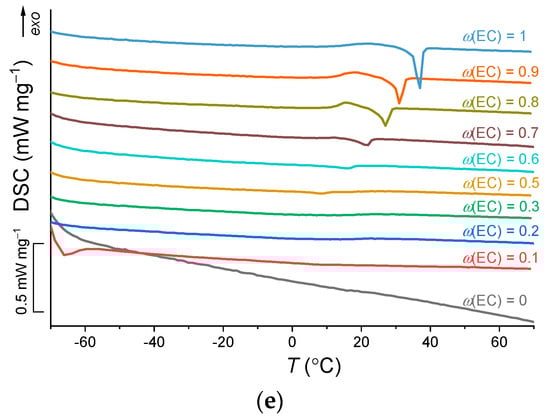 The phase transitions of the solvent mixture in Na-Nafion membranes at low temperatures were studied by DSC for the membranes swollen at 40 °C. It was shown in reference [] that a complete saturation of the lithiated form of Nafion with EC leads to a shift in the glass transition temperature of the membrane to below −80 °C. For Na-Nafion membranes swollen at 40 °C, no thermal transitions in the polymer are observed in the DSC curves (Figure 4e). For the samples with ω(EC) = 0.5–1, the curves show only the endothermic effect of the first-order phase transition associated with the melting of ethylene carbonate. As the EC content decreases, the melting enthalpy (ΔHm) decreases, and its maximum shifts toward low temperatures, from 36.4 to 9.1 °C (for Li-Nafion swollen in pure EC, this maximum is at the same temperature of 36.5 °C). The enthalpy of EC melting for the electrolyte swollen in pure EC is lower than for pure solvent (ΔH0 = 151.1 [] or 153.3 J g−1 []). Low values of ΔHm can only be explained by the fact that some amount of EC does not freeze, for example, because of solvation, i.e., in the “bound” state. Similar phenomena are also known for water-saturated [,] and DMSO-saturated [,] Nafion membranes. Taking into account that no phase transitions are observed for a membrane saturated with pure SL in the studied temperature range, it can be assumed that only EC freezes. The mass fraction of freezing EC (ωF) can be determined from Equation (4) without considering the thermal effect of solvation and ion association processes: