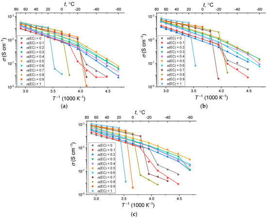 In the region of positive temperatures, the ionic conductivity of the studied membranes shows monotonous growth with an increase in the content of EC in the plasticizing EC–SL mixture (Figure 7a). At the same time, with an increase in Tsw, the conductivity also increases, which, due to increasing W-value, may also indicate the widening of transport channels in Nafion membrane, which, in turn, improves the migration paths of Na+ cations. The ionic conductivity of Na-Nafion membranes swollen at 80 °C increases by an order of magnitude from 0.06 mS cm−1 (pure SL) up to 0.6 mS cm−1 (pure EC) at 30 °C. This monotonous behavior of the Na-Nafion membranes differ from the lithiated form of Nafion, whose maximum of ionic conductivity is observed at ω(EC) = 0.8 [].