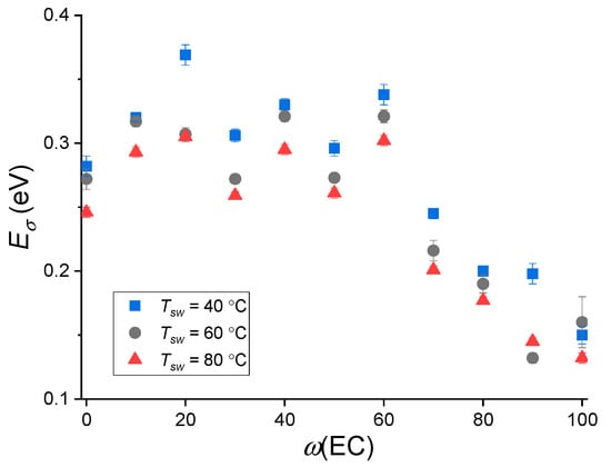 The calculation of the activation energy of conductivity Eσ was carried out according to Equation (6) from the straight line slopes of temperature dependence of conductivity shown in Figure 5. Calculated values of Eσ above the kink show a tendency to decrease by 10–20% with increasing Tsw (Figure 6). This effect is expected, since at a higher swelling degree, the transport channels become wider and the mobility of the solvated Na+ ions increases. If we consider the influence of the plasticizing mixture composition, then two regions are observed for the Eσ vs. ω(EC) dependence. In the first, with a high content of SL up to 0.4–0.5, the value of the activation energy does not depend on the composition of the solvents and equals to ~0.3 eV. With a further increase in the EC content, the value of Eσ linearly decreases to 0.13–0.15 eV.