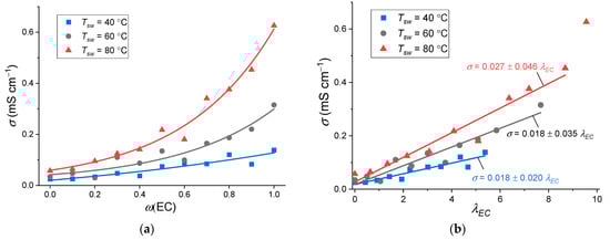 If we assume that the ionic conductivity is determined by the EC content, then the conductivity should depend linearly on λEC. The ionic conductivity as a function of λEC (Figure 7b), with the exception of the edge points, indeed has a linear character. However, at the same λEC value, with an increase in Tsw, an increase in the ionic conductivity is observed (the slope of the lines increases). Consequently, the swelling temperature affects the electrotransport properties of the resulting electrolytes not only due to an increase in the solvent content, but also for some other reasons.