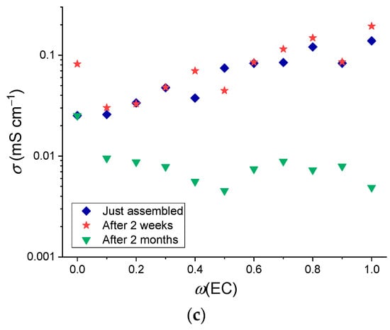 The effect of storage time on membrane conductivity was studied for the example of Na-Nafion membranes swollen at 40 °C. The conductivity of the samples was measured at 30 °C immediately after assembly, after 2 weeks, and after 2 months. After 2 weeks, the conductivity for most of the samples did not deteriorate (Figure 7c). After 2 months, the conductivity decreased by about an order of magnitude for pure EC and, with the exception of pure SL, the conductivity value seemed to become independent from ω(EC). The drop in conductivity can be explained by the fact that during this time the samples were kept in measuring cells with a spring pressing. As a result, the membrane thickness decreased by 10–20% compared to the initial one, and, consequently, part of the solvent left the membrane, which led to deterioration in the migration of sodium ions.