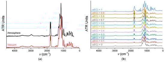 Initially, the spectra of a membrane sample swollen at 40 °C with ω(EC) = 0.5 were recorded at atmospheric pressure and under vacuum (Figure 8a). This was done to select the optimal experimental conditions under which the membrane would not absorb water from the air (–OH bond vibration band at ~3500 cm−1) and the solvent would not be removed from it. The spectra practically do not differ from one another, so it was decided to record the spectra under vacuum in order to exclude the accumulation of water from the air.